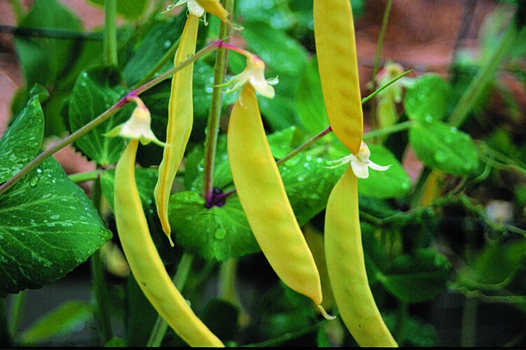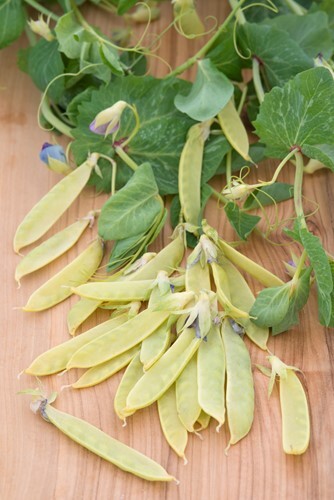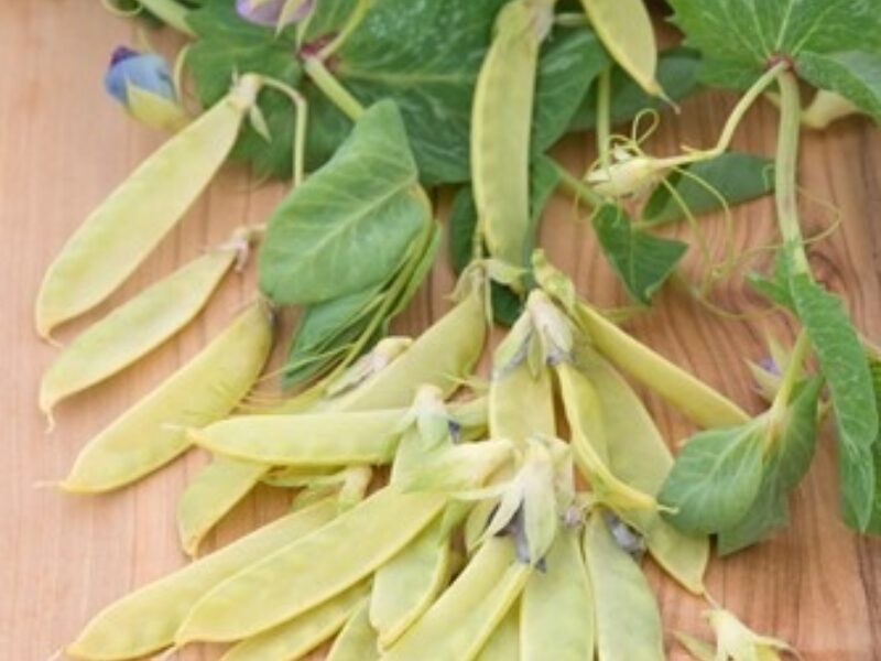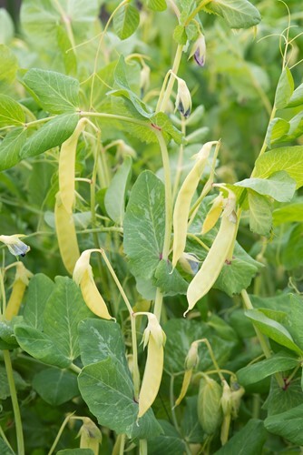 heirloom sugar pea from 1860, eaten as golden yellow pods, attractive purple flowers are also edible and useful as a colourful garnish