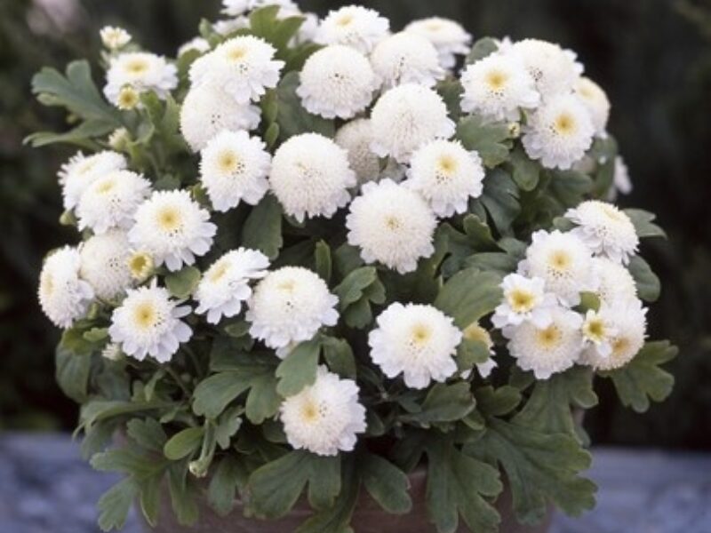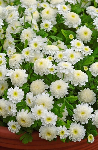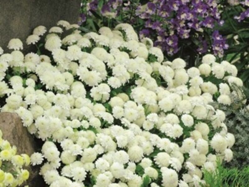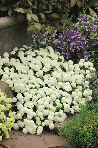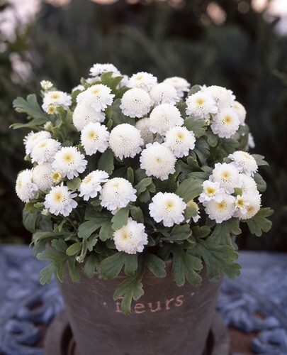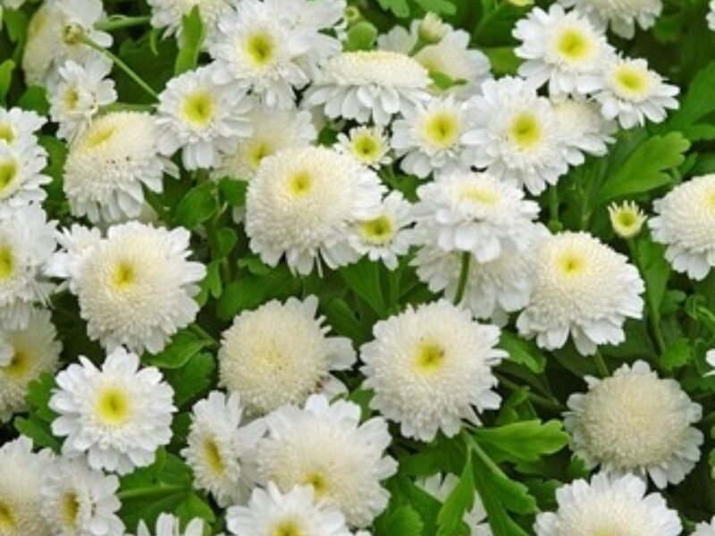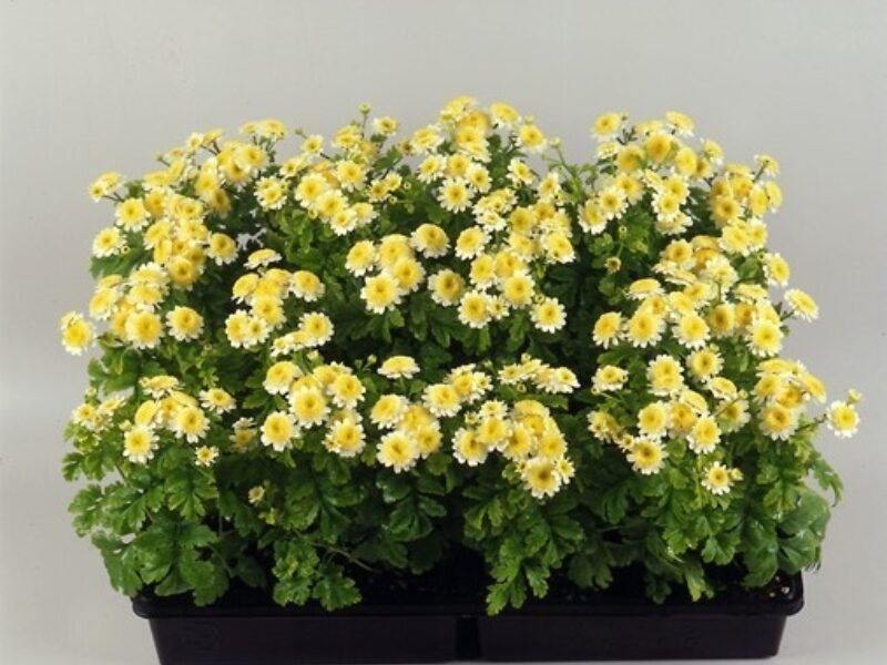 Ideal for borders, landscaping, and pots, Carlos is a day-length neutral Tanacetum featuring chrysanthemum-type flowers with a soft yellow centre and playful white frilled petals.